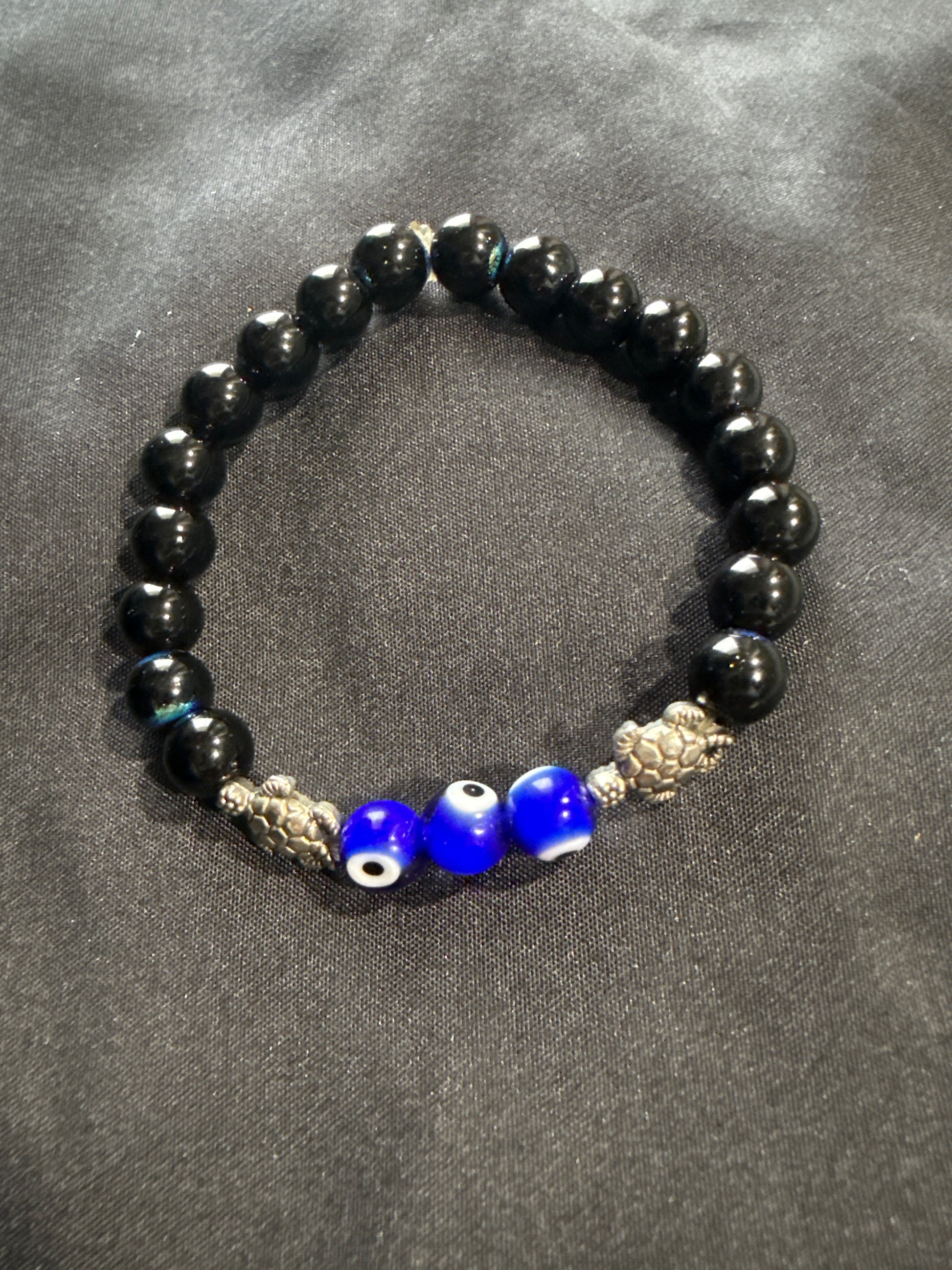 A powerful trio of protection, resilience, and wisdom, this bracelet combines the grounding force of Black Onyx, the shielding gaze of the Evil Eye, and the steady strength of the turtle — a symbol of endurance and life’s long journey.