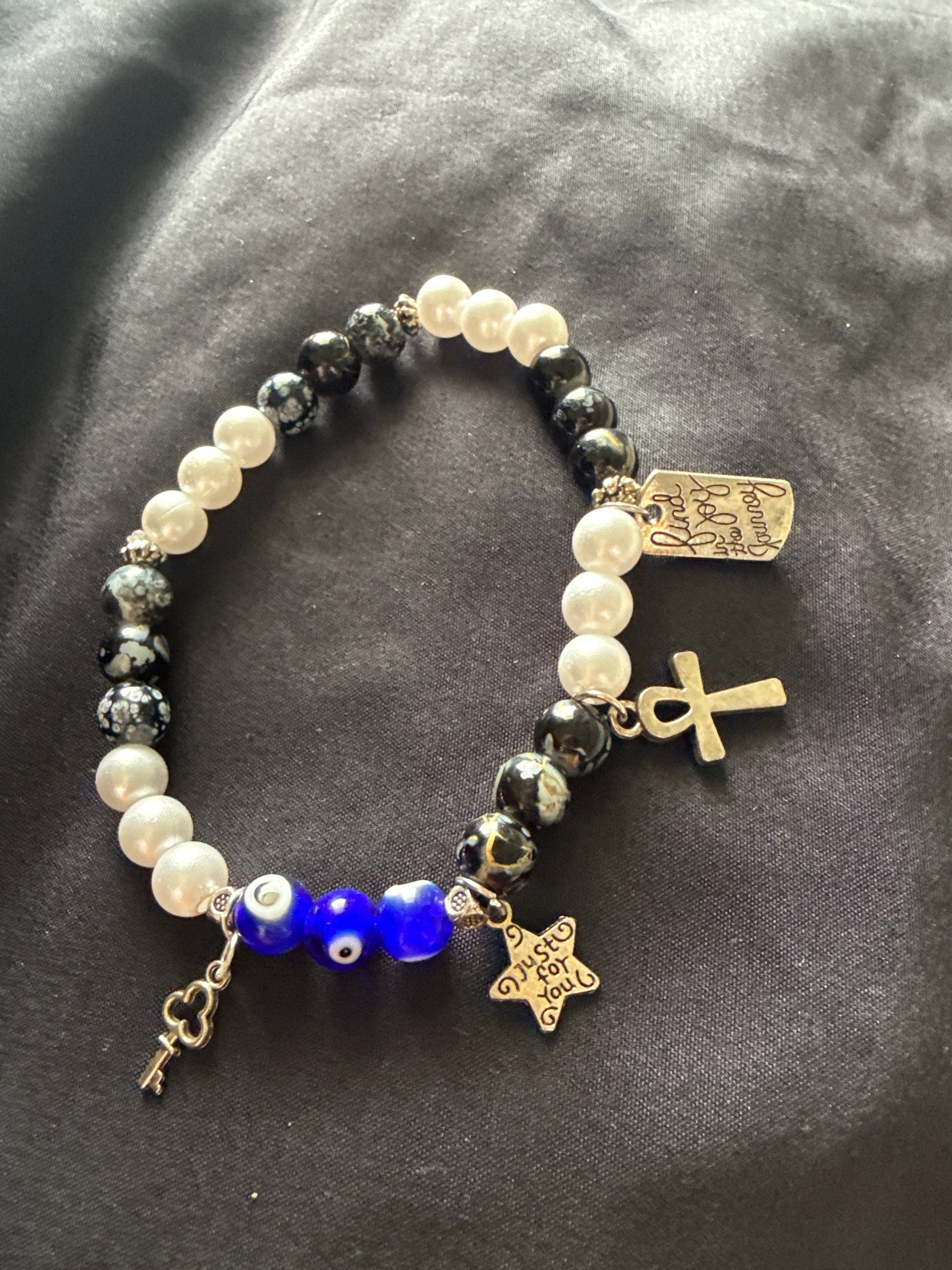 Unleash your spirit with the WildWrist Bracelet, a fearless fusion of classic white pearls, black & gold marble beads, and mystical accents. Symbolic evil eye beads offer protection, while a delicate key charm whispers of secrets unlocked and the star charm guides your journey forward.